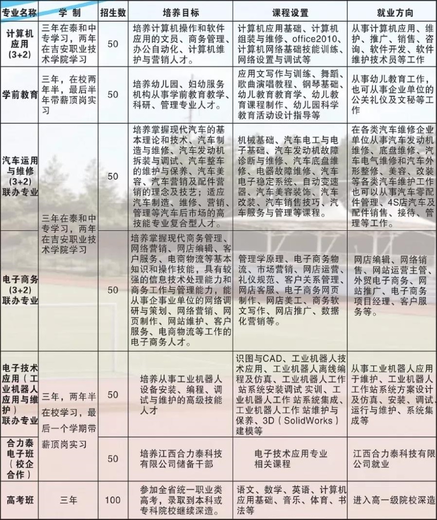 泰和中等专业学校是泰和县唯一一所公办类职业学校。原名江西共产主义劳动大学泰和分校,创办于1958年,1995年搬迁至现址,同年改为泰和职业中等专业学校,1996年被国家教委批准为首批国家级重点职业高中,2004年被国家教育部认定为国家重点中等职业学校。2018年6月,被省教育厅批准设置为全日制普通中等专业学校。